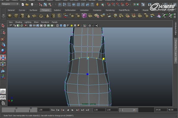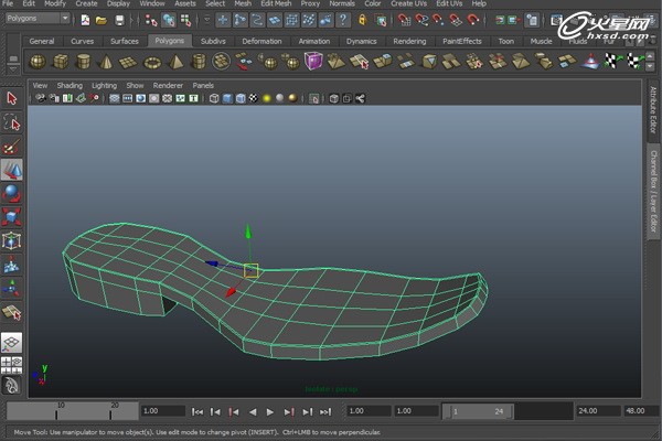 將鞋底孤立顯示出來。選擇頂部的一圈邊,執行菜單命令“編輯網格>橋接”。