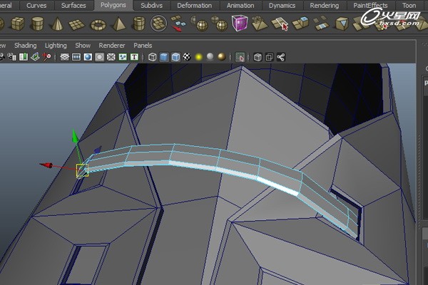 現在我們來製作鞋帶孔。執行菜單命令“編輯網格>交互式分割工具”在兩側各創建三個正方形,如下圖所示。