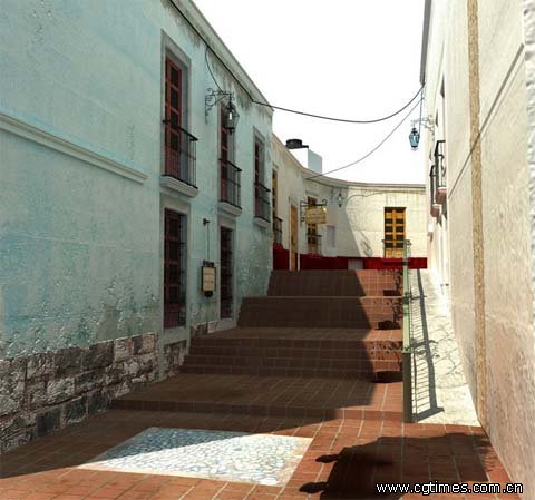 根據參考照片選擇建築和地麵的顏色,然後使用 3dtotal 紋理庫的紋理貼圖,在 Photoshop 使用蒙板、濾鏡和加亮/減淡工具調整並混合。
