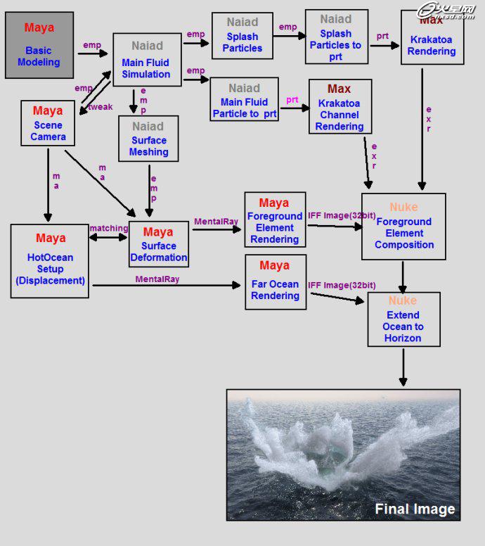 以下的製作解析部分,如果具備基本的Naiad、Maya、3ds Max及Nuke的軟件基礎,那麼理解起來會更容易一些。