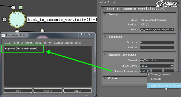 如圖7,C節點是一個Particle-Nel-Channel,用於獲取粒子vorticity的強度值。老外教程裏的方法通常都是使用一個Field-Nel-Channel和一個Particle-Nel-Channel來得到vorticity的矢量,我把表達式優化之後隻需要一個Particle-Nel-Channel節點就可以得到vorticity的矢量,但圖7中我寫的表達式並不是去獲取vorticity的矢量,而是獲取了vorticity的強度。