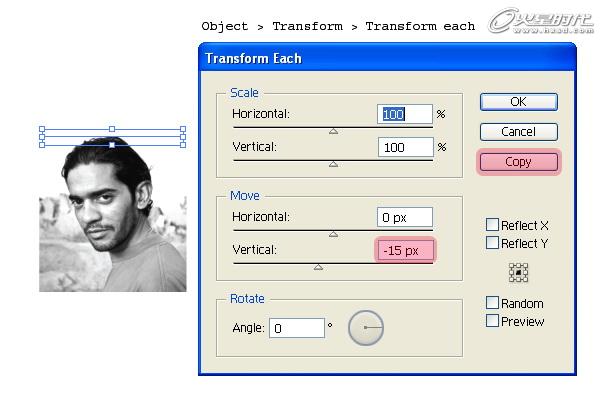 選擇線條,點“對象菜單->變換->分別變換(Alt+Shift+Ctrl+D)”。垂直移動:輸入-10px,點“複製”。下一步,按Ctrl+D直到線條到達圖片(描摹區)底部。(注:垂直移動框內,你輸入的數值,結果要能清晰地看見複製的線條。這裏我使用的是-15px。)(圖04、05)