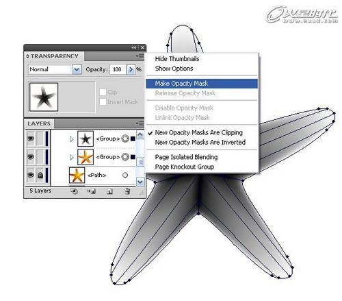 13、假使你沒有準確的把網格對象貼合到海星,這裏提供給你一個辦法可以彌補該不足。首先選中最低端的海星星狀,然後複製粘貼到最頂端,然後選中所有的網格對象和形狀,來到“對象->剪切蒙版->創建”。(圖34)