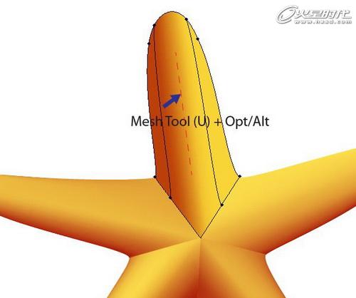 移動矩形漸變網格的其他點,使漸變對象貼緊海星輪廓。漸變網格的邊不要超過海星輪廓為宜,最好是它們之間留一條小小的縫隙。(圖18)