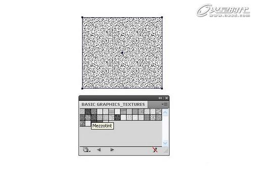 14、開始創建海星的紋理。新建一個基本的幾何形狀,例如,一個矩形然後選擇紋理。經過一段時間的實驗,最後我選擇了Mezzotint紋理。該紋理你可以從色板麵板中找到:色板庫->圖案->基本->基本圖形->Basic Graphics_Textures。(圖35)