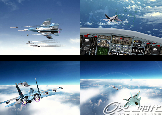 第二部分以描寫空戰為主,動作設計主要以飛機空中格鬥為主,涉及到飛機的飛行軌跡,飛機尾焰的製作,導彈的製作等。在設計飛機飛行軌跡的時候,參考了很多影視作品和遊戲片段,像“絕密飛行”,“空中決戰”等。有些鏡頭製作的很誇張,也是根據我自己的想法做的,雖然並不真實,但是這樣可以吸引觀眾的視線。設計飛機的動作花了不少時間,不停地調試,力求做出最逼真的畫麵效果,這個階段也比較痛苦,走了很多彎路,做了很多重複的工作,不過最後還是堅持下來了。