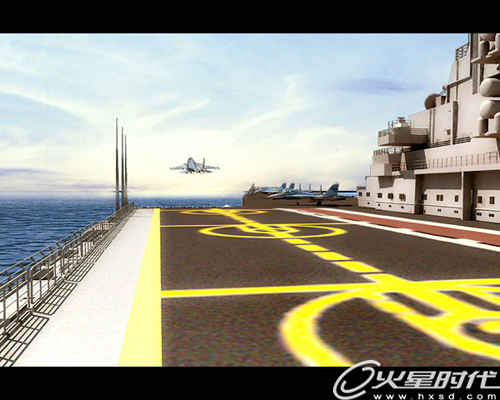 對我軍場景的描寫也是采取了大鏡頭描寫和局部鏡頭特寫,片中出現的航母是虛構的,但是為了劇情需要,我把一艘經過修改過的基輔級航母航加了進來,通過不同視角的鏡頭效果運用,可以使畫麵更豐富。艦載機本來想用國產的殲10戰機為主,考慮到殲10的畫麵效果沒有蘇霍伊戰機漂亮,最後決定用蘇30為主角,殲10和蘇27為配角,同時在動畫製作的中期,為了進一步強化中國的空戰能力,我把一架Y22戰機改裝成我軍的主力戰機,並且給了很多特寫。