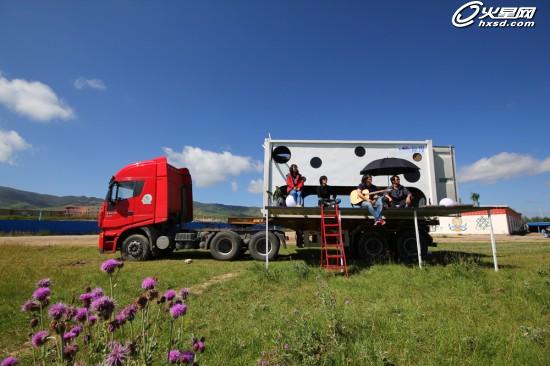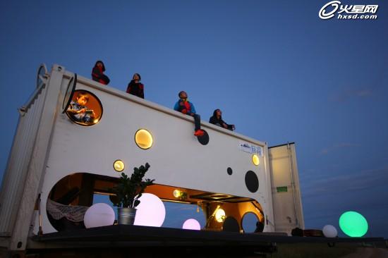 當我們將集裝箱的外壁打開,這裏就是一個平台,所有人可以在平台上玩耍或者表演節目。在青海湖時,一位馬農就被這個奇怪的建築所吸引,詢問能否上來玩玩,同時熱情邀請眾人去騎他家的馬。在草原時,大家把投影儀打在集裝箱側壁屏幕上,還可以看電影。在九寨溝時,遊客被我們的車房吸引過來,最多時候,這個平台能夠容納多達30人在上麵玩耍,完全無壓力。