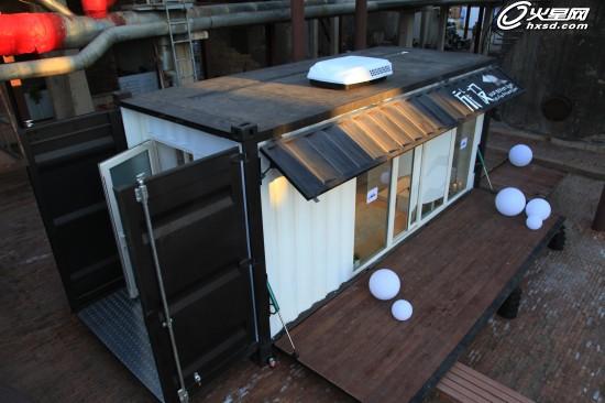 “集客概念車房”有著兩層牆壁,外麵是集裝箱的鐵皮,裏麵是複合木牆壁。運輸過程中,得關上鐵皮;到達目的地後,就可以打開鐵皮露出房子的模樣。在11平方米室內麵積的集卡裏,有著占地一平方米左右的廁所和一個工作間,以及通過錯層設置在空中的5張床。在薄薄的複合木牆壁裏,6個不同的線路跟車頭的超大伏安蓄電池相連。廁所地板采取了防腐木,為了免得在狹小空間裏的尷尬,廁所門上有音樂按鈕,這樣可以通過音樂聲遮蓋上廁所的聲音。