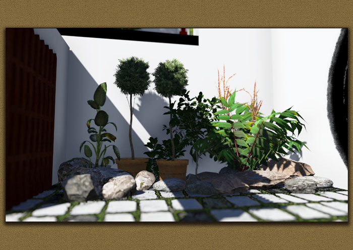 以上是部分模型的創建過程。接下來是將模型導入到Lumion中,加入一些植物和配飾,將場景豐富起來。之所以在這裏是用Lumion,是因為Lumion具有快速高效的優點。當然與3ds Max對比缺點也是很明顯的,即不夠真實。下麵是Lumion中的部分圖紙。