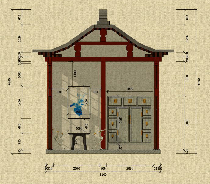 這個設計是圍繞中式茶館來表現的,主要從建築、園林和室內裝飾三個方麵來說。