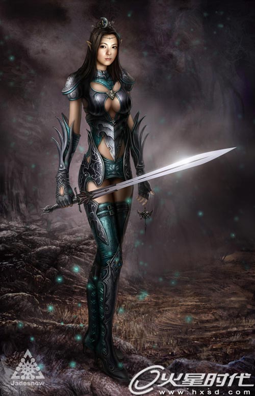 時間與空間的交織,正義與邪惡的對立。精靈女戰士月亮般清冷的臉龐在光影明滅中安靜閃耀,不安與嗜血在地殼深處暗湧。而此刻緊握的劍在不安分的騷動,正在訴說一個遠久不老的誓言。精靈族的裝飾一般來源於自然,所以衣服整體造型和裝飾都來源於自然物體,比如樹葉,月亮,花朵等。這幅畫的姿勢很普通,主要從繪畫技巧和細節來表現。