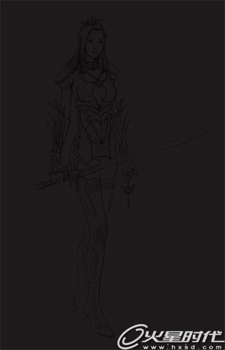 3、考慮光源。首先必須確定光源從哪個方向來的,從哪個地方消失。這樣明暗麵就可以分清楚。用邊緣模糊的噴槍柔邊圓形畫筆來畫出人物的亮麵,把立體感要表現出來。這張畫采用了兩種顏色分出人物裏麵穿的衣服和外麵的盔甲。
