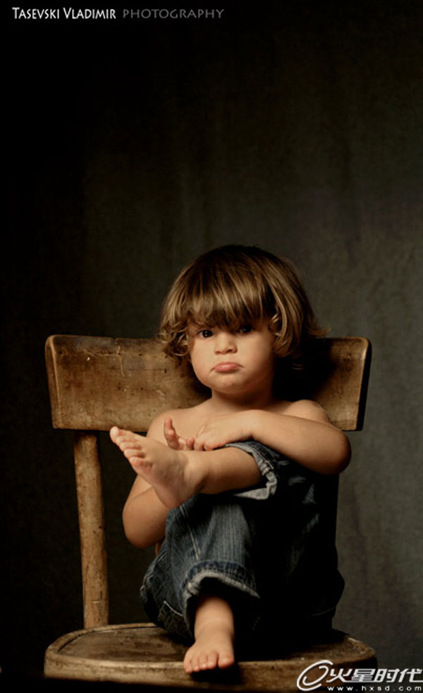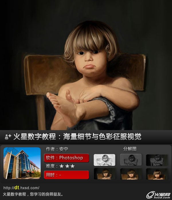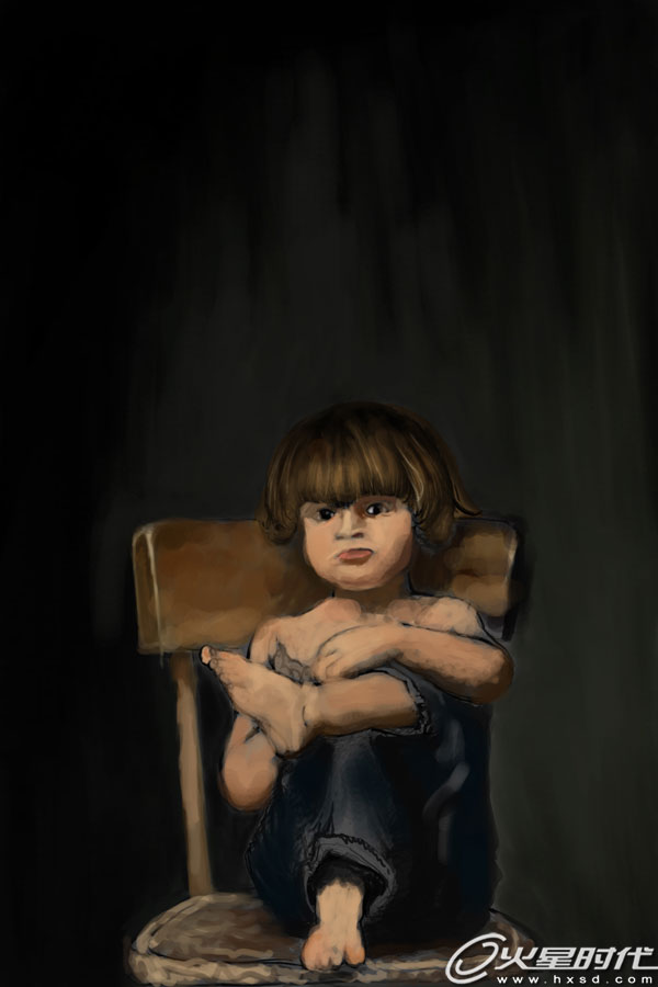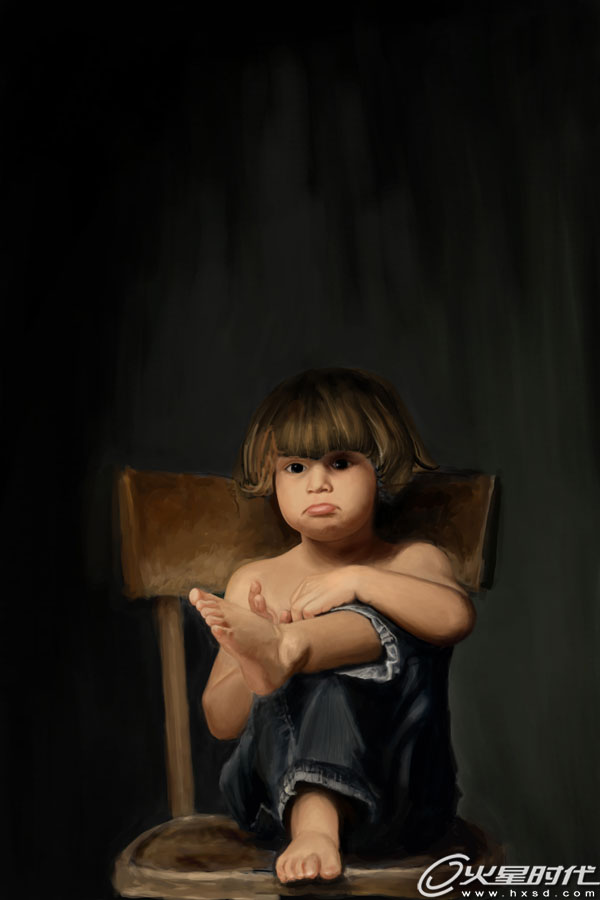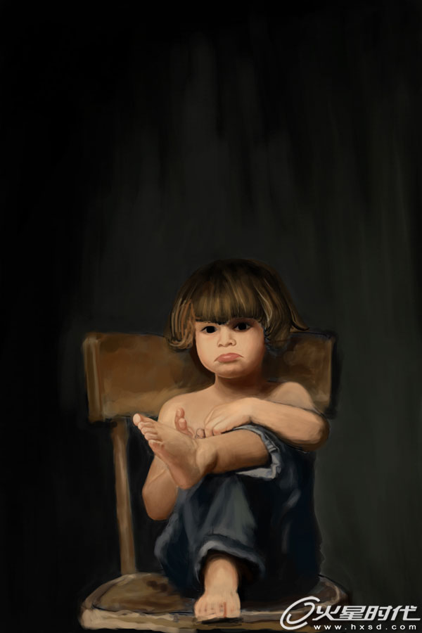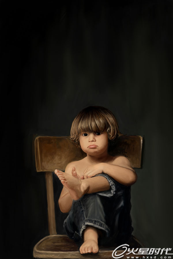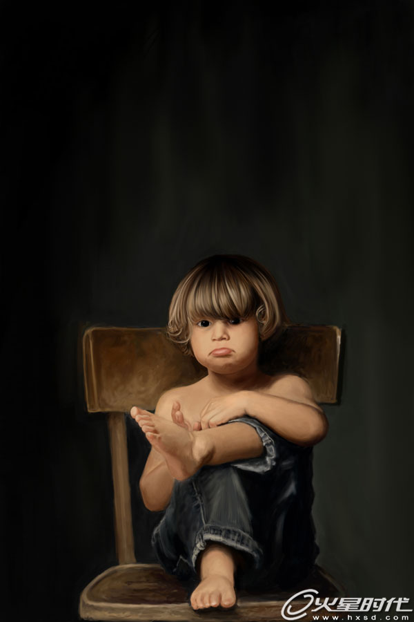 對麵部進行更清晰的刻畫,一些難度比較大的細節要用心觀察,例如下巴、嘴角,小男孩的左臉蛋。牛仔褲的布紋也可以進行一下刻畫。同時椅子的細節紋理也要跟進,例如男孩屁股附近的棕色。我注意到照片上男孩的腳趾是紅潤的,有種半透明的感覺。半透明的效果完全可以通過色彩來表現。經過觀察,我總結出半透明的特點:背光的地方增加一些粉紅偏橘紅的肉色漸變(朋友們看畫麵的左腳小腳趾就明白我的意思了,試圖給某種顏色命名本來就是一件很愚蠢的事情……),另外在下部增加一點點反光,效果會更好。