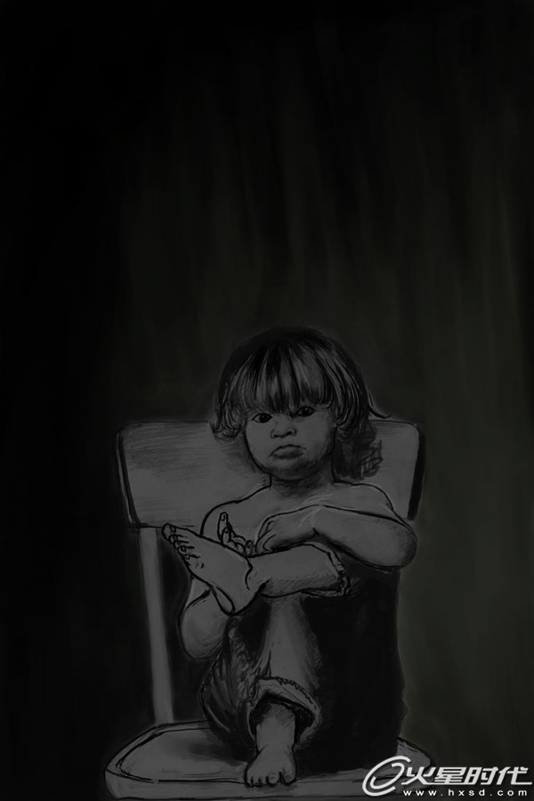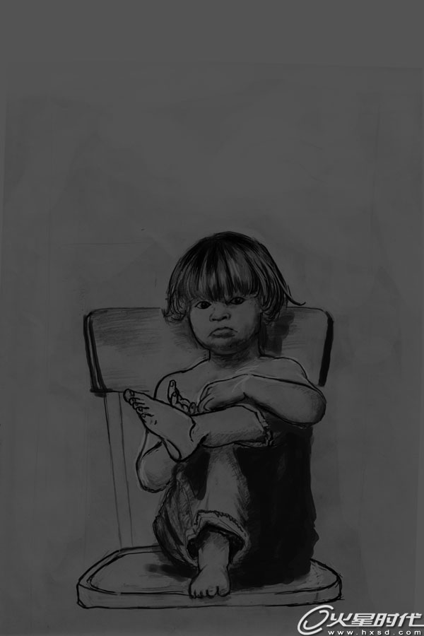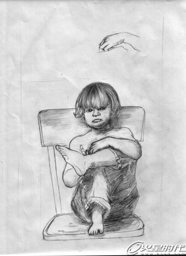 圖11,對椅子的形狀進一步調整,男孩的右腳形狀更加明確地畫出來。唯一需要做的是仔細觀察照片,並把我看到的畫下來。要注意體現人物的特點,小男孩的手腳都是胖乎乎的,特別是左腿離腳腕比較近的地方,似乎還有一些向下墜。