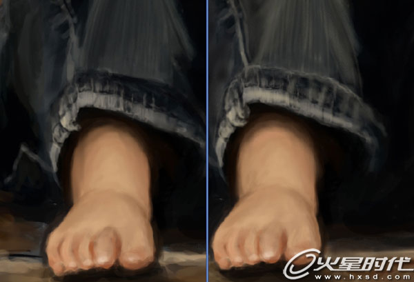 圖13,我注意到牛仔褲褲管部分沒有體現出應有的厚度,顯得太單薄了,經過仔細觀察,我發現問題處在高光上,高光太強列,太尖銳了;高光的位置也不對,高光不應該 出現在最邊緣,而應該離邊緣有一段距離,這樣就能顯得有一定厚度。此外還應該把牛仔褲邊緣磨損的細節添加上去。顏色上,我又加了點偏灰的黃綠色,顯得更有質感,單純的藍色總會給人一種很假的感覺,正如開篇所說,物體所表現出來的顏色是非常豐富的,這才增加了一種色彩,效果立即就不一樣了。這樣,牛仔褲看上去就很真實了。修改前後兩個細節的對比如圖14和圖15。